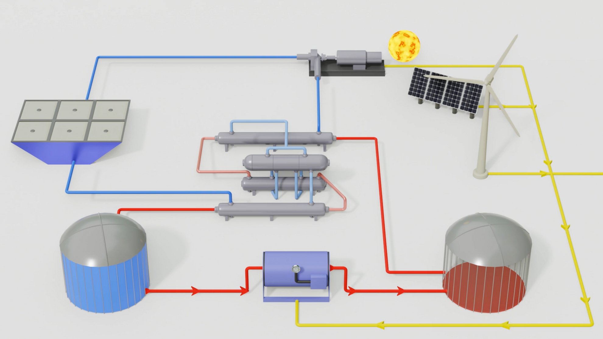 A Carnot Battery transforms electricity into thermal energy. During the charging process, excess electricity from PV panels and wind turbines is converted into heat by means of an electric heater and stored in molten salt tanks. During the discharging process, the stored heat is converted back into electricity. The waste heat from this process can subsequently be used for district heating.