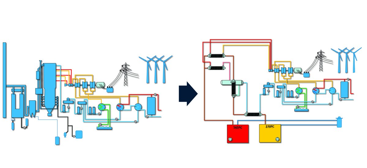 A large part of the existing infrastructure can be re-used. This includes e.g., the steam turbine, generators, condensing heat exchangers and water treatment equipment as well as high value components for switching, transforming, and transmitting high voltage power. To facilitate a complete replacement of a coal-fired boiler unit, an electric molten salt heater and two molten salt storage tanks with integrated steam generation systems must be installed.