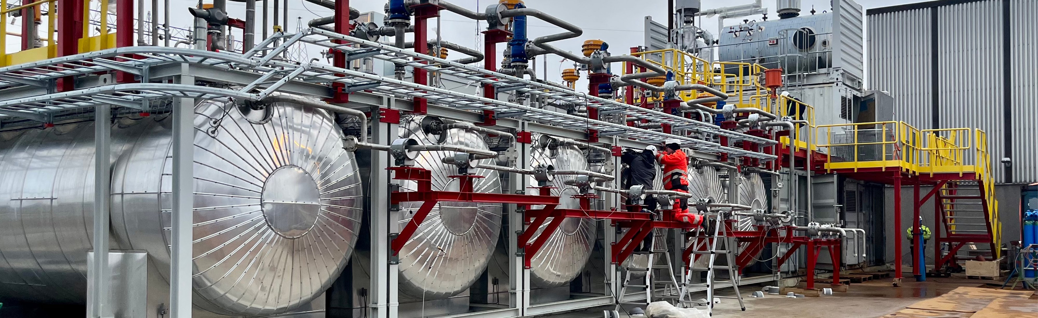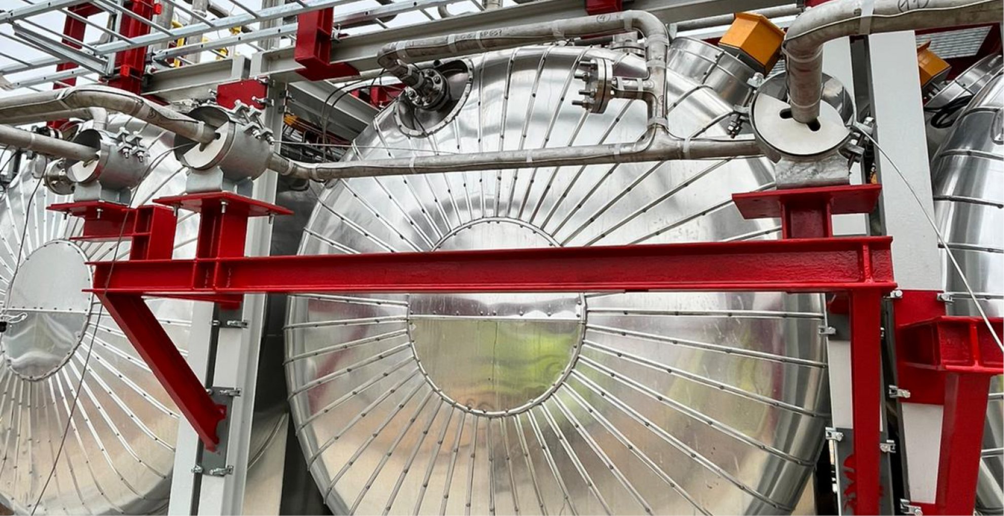 Electricity from solar PV and wind turbines is stored in a two molten salt tanks. On demand, the energy is converted back to steam, to be used for the production of electricity, steam or heating. The molten salt steam generator is based on the header-coil technology, which is a fundamental building block for reliable long-term thermal storage. It is the only existing heat exchanger type with high long-term reliability and efficiency under cyclical load conditions, which is a critical point of focus for PTXSALT plants.